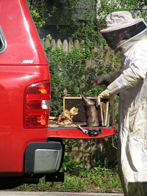 A few weeks later the bees arrived. He opened the back of his vehicle and there were boxes and boxes of bees for the new hives he's setting up -- and a few strays just flying around.